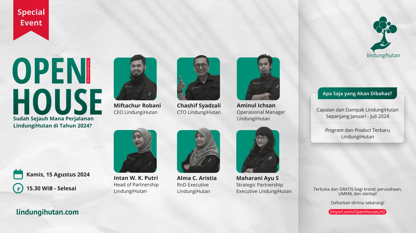 Untuk memperkuat kerja sama dan merayakan berbagai pencapaian dalam menjaga kelestarian lingkungan, LindungiHutan akan menyelenggarakan Open House secara daring pada Kamis, 15 Agustus 2024. Acara ini ditujukan khusus mitra perusahaan/brand yang dirancang sebagai wadah berbagi pengalaman, pencapaian, dan kisah sukses yang telah diraih bersama selama perjalanan dalam melestarikan lingkungan.