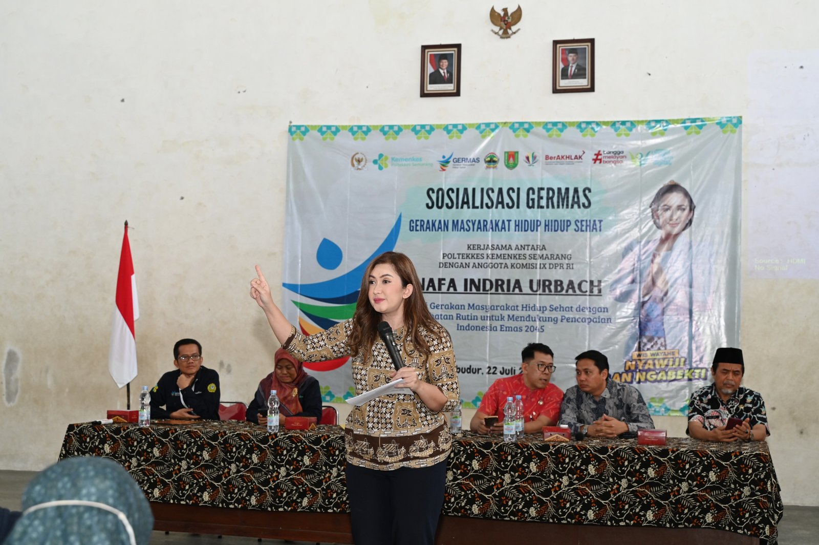 MAGELANG | HARIAN 7 – Sebagai upaya untuk memperkenalkan dan menyebarluaskan Gerakan Masyarakat Hidup Sehat (GERMAS) kepada masyarakat luas. Poltekkes Kemenkes Semarang bekerjasama dengan anggota DPR RI komisi IX menggelar Sosialisasi pada, Selasa (22/7/2025) bertempat di Gedung serbaguna Desa Bumiharjo, Kecamatan Borobudur, Kabupaten Magelang.