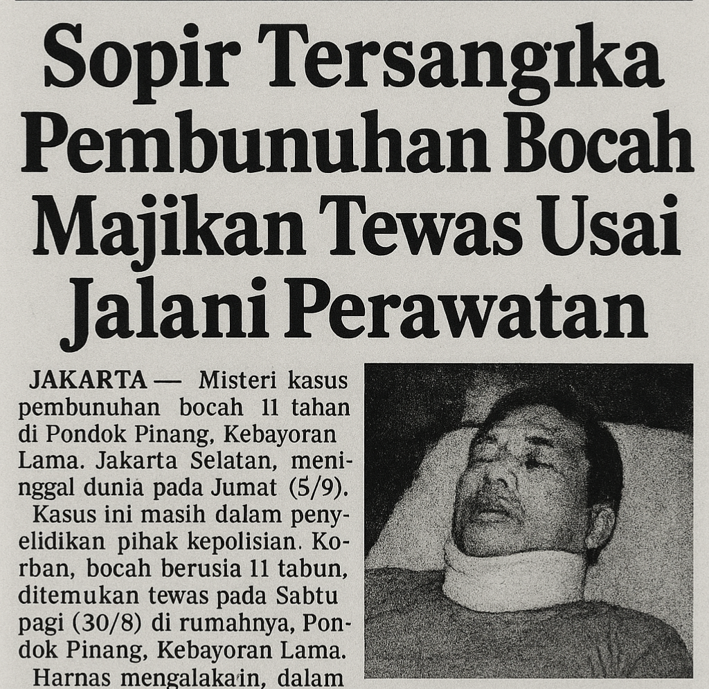 JAKARTA | HARIAN7.COM – Misteri kasus pembunuhan bocah 11 tahun di Pondok Pinang, Kebayoran Lama, Jakarta Selatan, memasuki babak baru. Sopir yang ditangkap sebagai pelaku utama ditemukan meninggal dunia saat menjalani perawatan di RS Polri Kramat Jati, Jumat (5/9/2025).