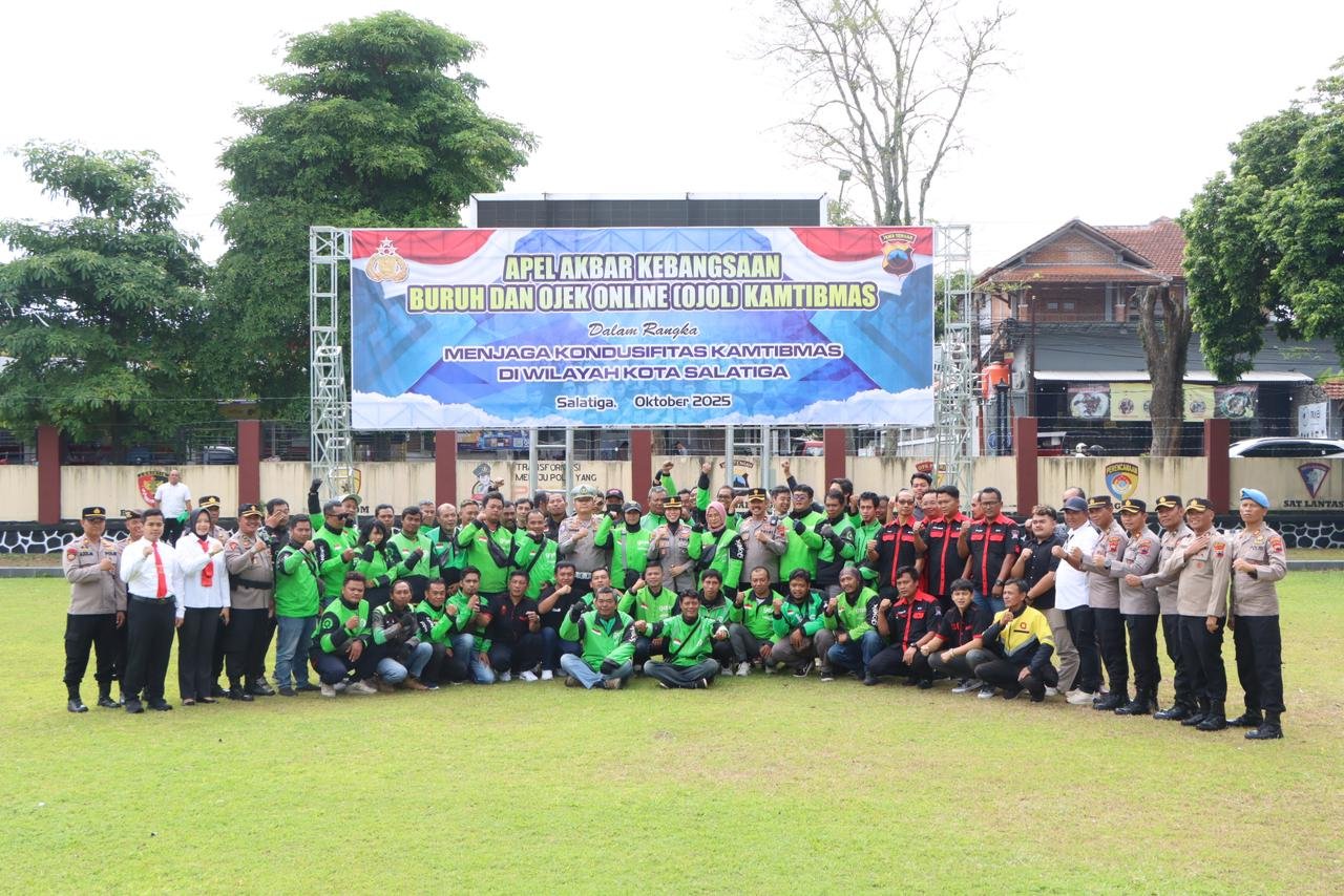 SALATIGA | HARIAN7.COM – Ratusan pengemudi ojek online, perwakilan buruh, dan komunitas lalu lintas mengikuti Apel Akbar Kebangsaan Buruh dan Ojol Kamtibmas di Lapangan Bhayangkara Polres Salatiga, Senin (27/10/2025). Kegiatan dipimpin langsung Kapolres Salatiga AKBP Veronica.