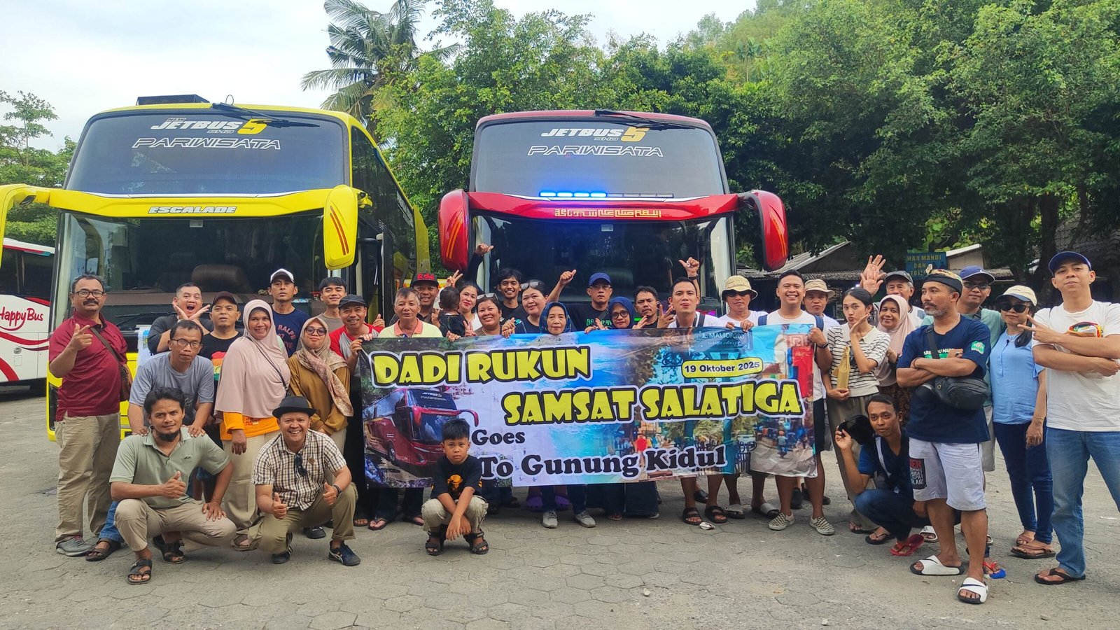 Rombongan Paguyuban “Dadi Rukun” berangkat ke Yogyakarta dari depan Samsat Kota Salatiga, Minggu(19/10) pagi sekira pukul 07.00 WIB dengan menggunakan jasa transportasi 2 Bus masing masing berkapasitas 52 orang.