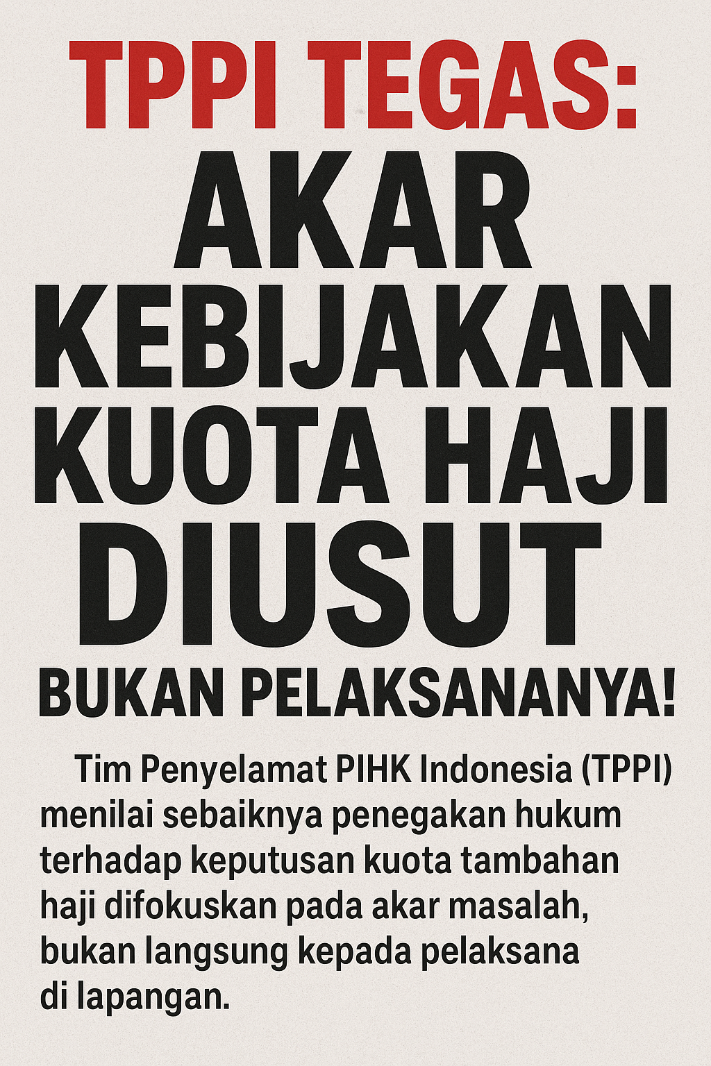 Sebagai catatan, TPPI merupakan gerakan moral dan advokasi nasional yang beranggotakan penyelenggara haji khusus dari seluruh Indonesia. Tujuan mereka jelas: memperjuangkan kepastian hukum dan keadilan bagi pelaksana ibadah haji agar tak menjadi korban kebijakan yang multitafsir.