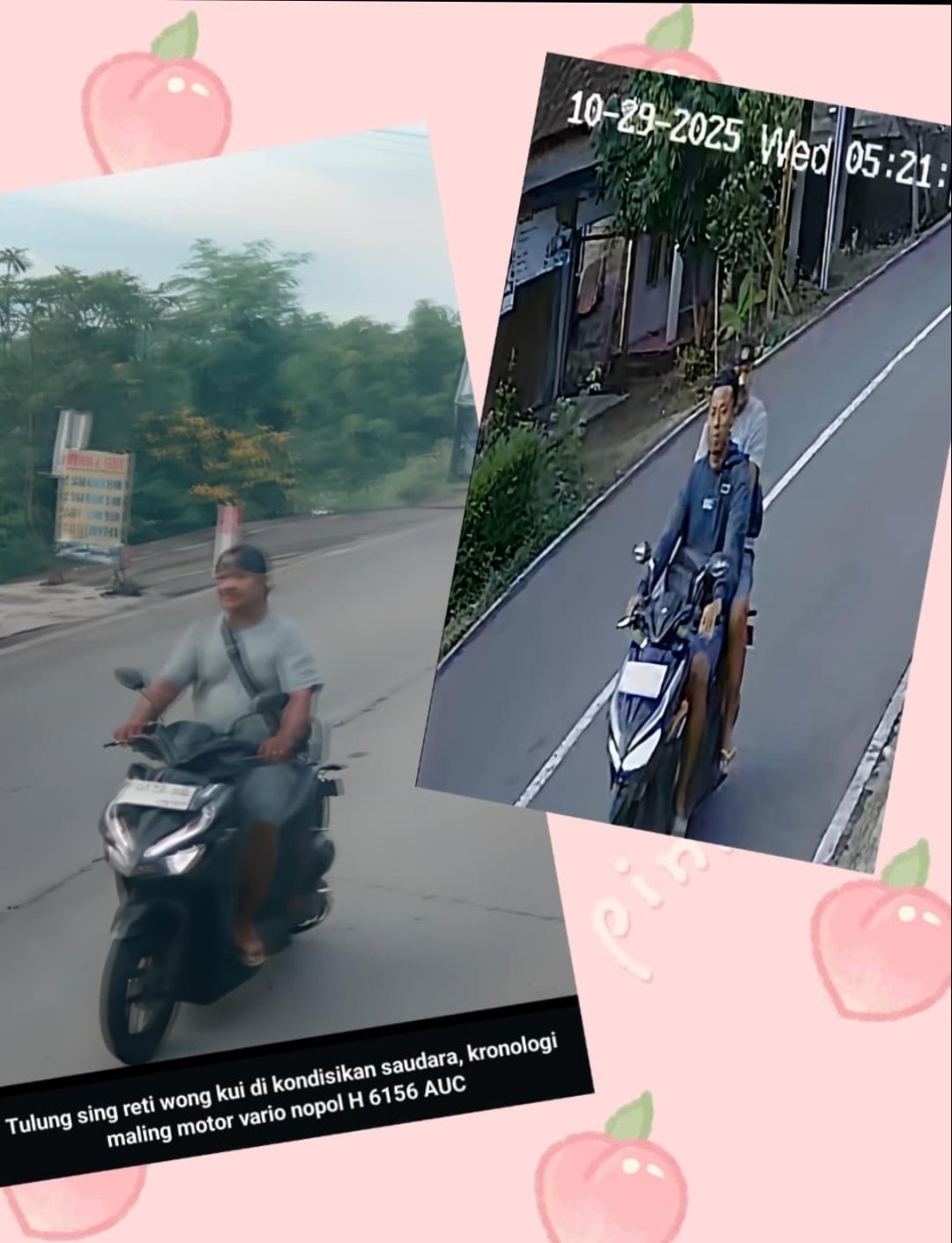 Momen disaat membawa sepeda motor, terduga pelaku pencurian terekam jelas kamera pengawas (CCTV) milik warga.
