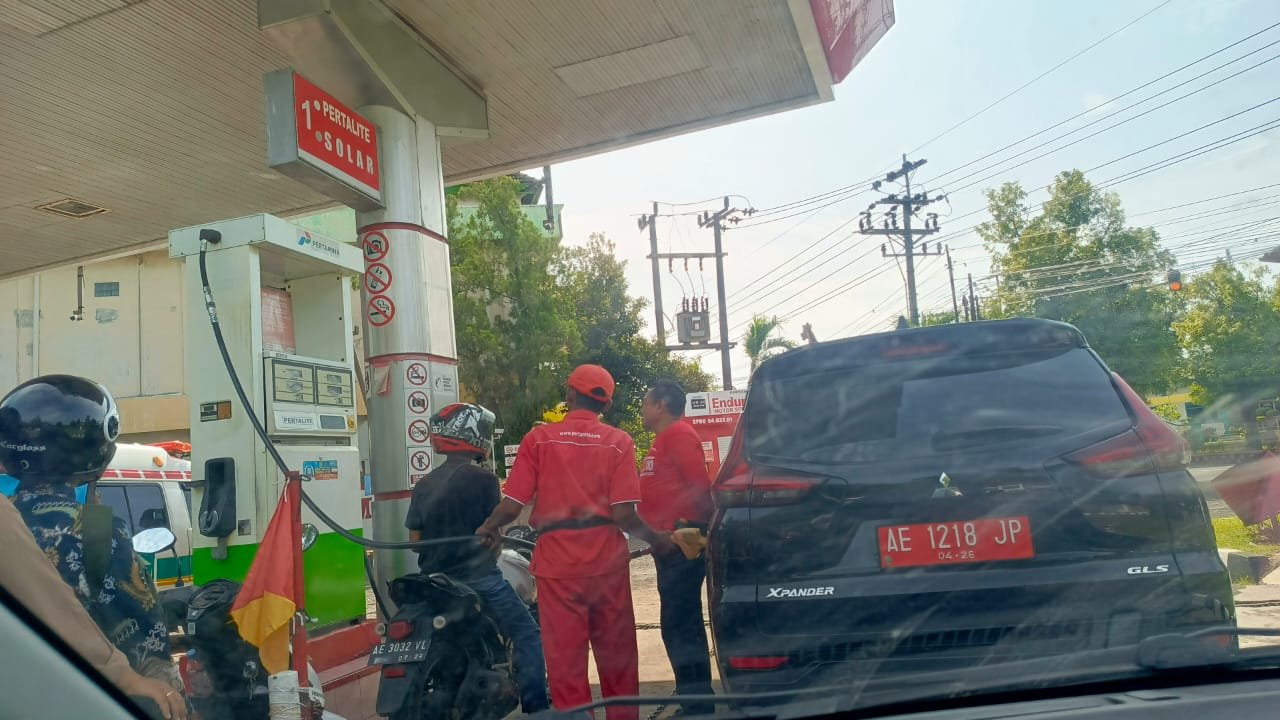 Mobil dinas jenis Xpander bernopol AE 1218 JP, yang diketahui milik Dinas Lingkungan Hidup Kabupaten Ngawi, dengan santainya antre bersama motor-motor warga. Pemandangan yang terasa janggal sekaligus ironis: kendaraan negara yang seharusnya menjadi contoh justru ikut berebut BBM murah.