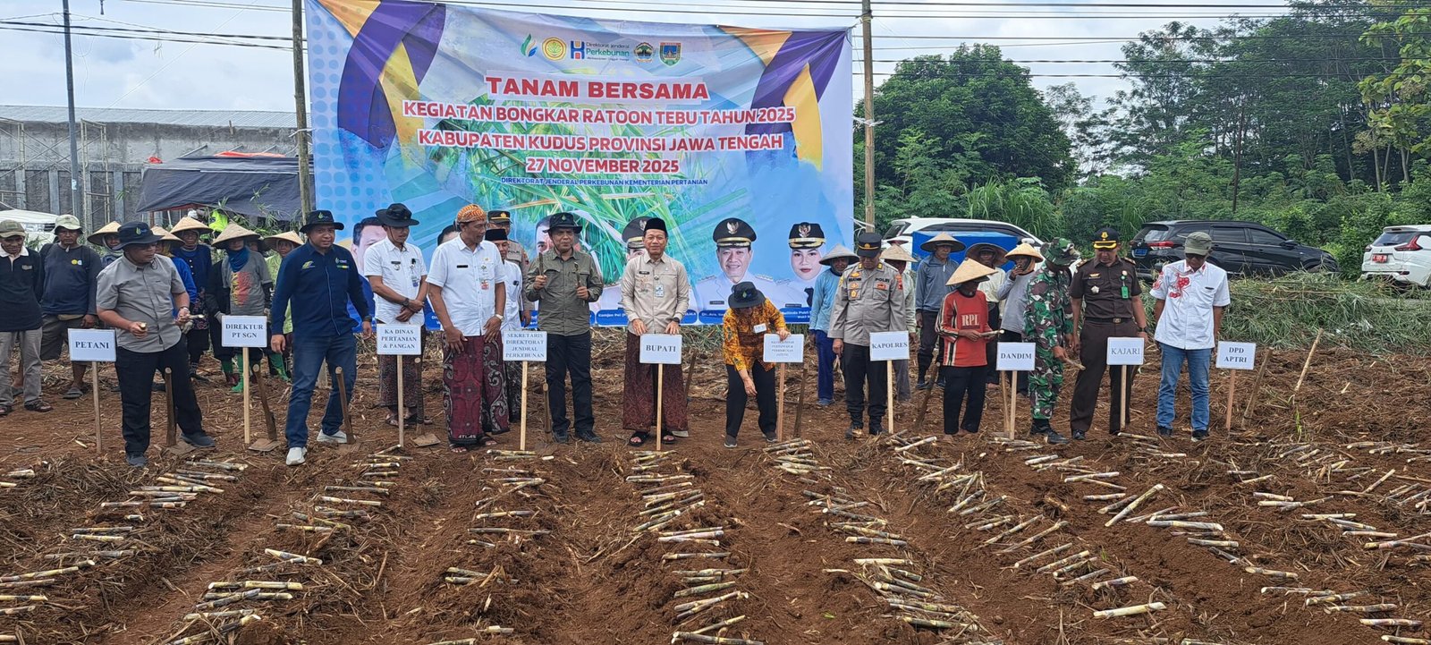 Komitmen tersebut ditegaskan Bupati Kudus, Sam’ani Intakoris, saat menghadiri kegiatan Tanam Bersama Bongkar Ratoon dan Perluasan Area Tanam Tebu 2025 di persawahan Gapoktan Bangunharjo, Desa Honggosoco, Kecamatan Jekulo, Kamis (27/11/2025).