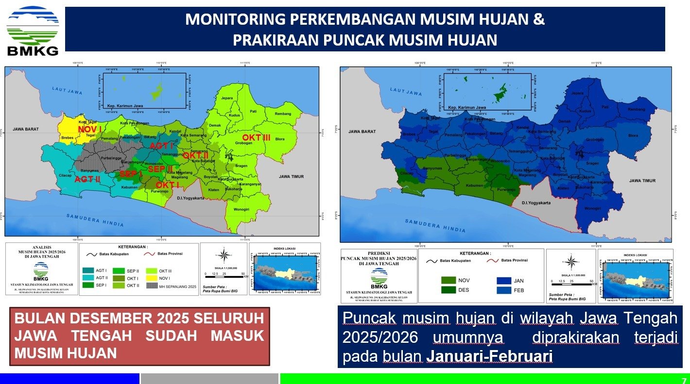 Khusus di Pulau Jawa, terutama Jawa Tengah, BMKG memperkirakan puncak musim hujan akan berlangsung pada Januari hingga Februari 2026. Pada periode tersebut, potensi cuaca ekstrem diprediksi meningkat, dengan ancaman banjir dan tanah longsor di sejumlah daerah.