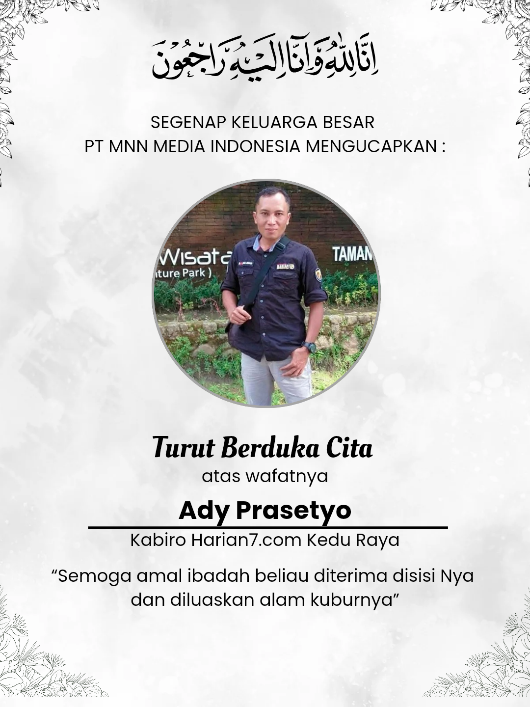 Direktur Utama PT MNN MEDIA INDONESIA, Muhamad Nuraeni, menyampaikan belasungkawa yang mendalam atas wafatnya almarhum Ady Prasetyo.