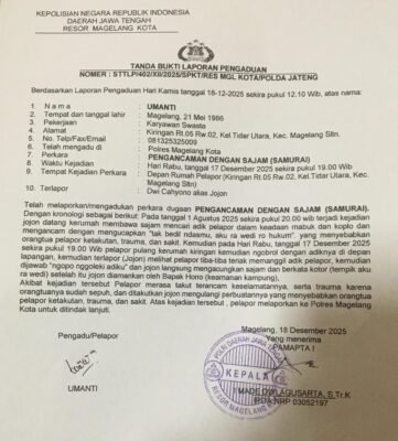 Umanti ditemani suaminya yang juga Ketua LSM Harimau Magelang mendatangi SPKT Polresta Magelang, Kamis (18/12/2025). Bukti pelaporan tercatat dengan nomor STTLP/ 402/ XII/2025/ SPKT/ RES MGL KOTA/ POLDA JATENG.