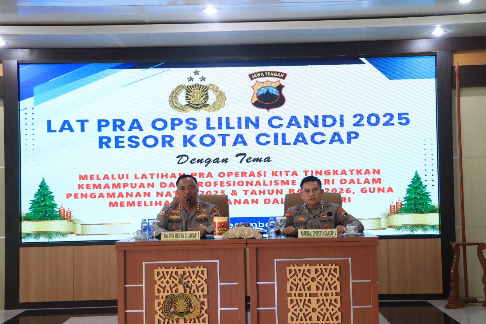 CILACAP | HARIAN7.COM – Kapolresta Cilacap, Kombes Pol Dr. Budi Adhy Buono, S.I.K., S.H., M.H. di dampingi, Kabag Ops AKBP Totok Nuryanto, S.H., M.M, pimpin Latihan Pra Operasi (Latpraops) Lilin Candi 2025 di Aula Patriatama Polresta Cilacap, Kamis (18/12/2025). Kegiatan ini dilaksanakan sebagai bentuk kesiapan Polresta Cilacap dalam pengamanan Natal 2025 dan Tahun Baru 2026.