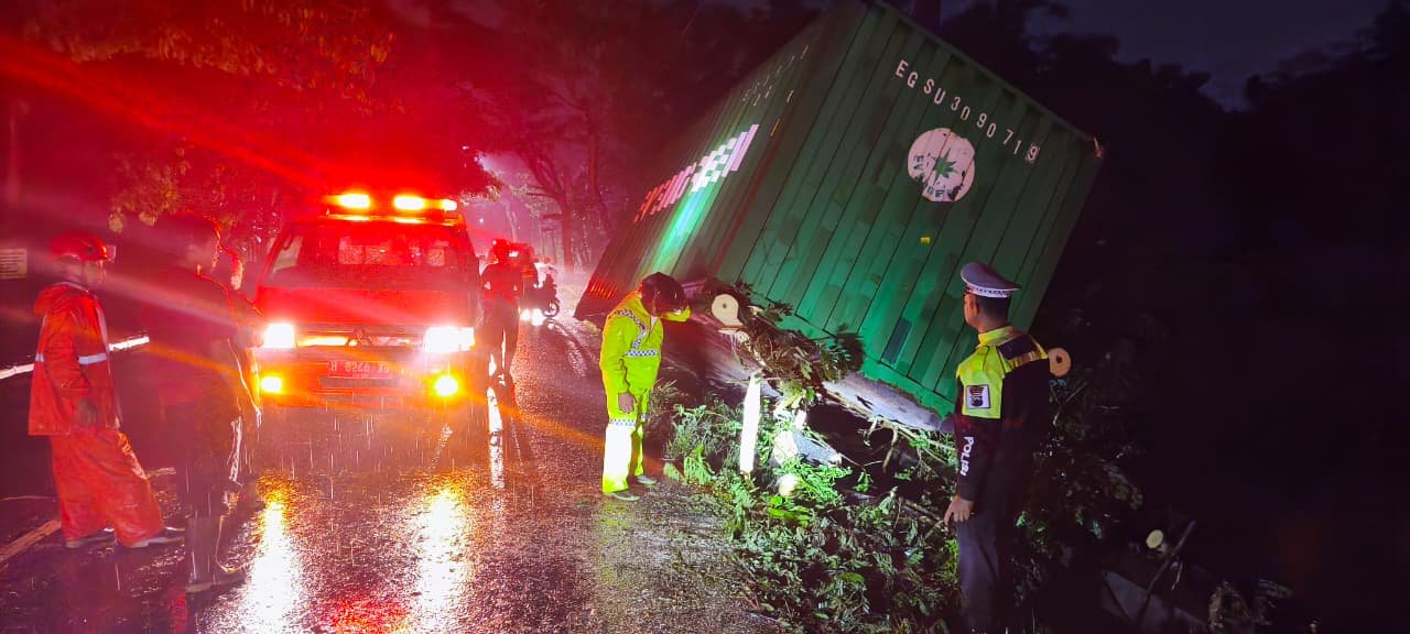 SALATIGA | HARIAN7.COM – Kecelakaan lalu lintas tunggal terjadi di Jalan Lingkar Selatan (JLS) Salatiga, tepatnya di kawasan Dukuh, Kecamatan Sidomukti, Kota Salatiga, Senin malam, 19 Januari 2026. Insiden tersebut melibatkan satu unit truk kontainer yang tengah melintas di jalur tersebut.
