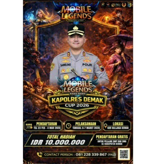 “Siapkan tim terbaikmu dan tunjukkan skill kalian di ajang bergengsi Kapolres Demak Cup Mobile Legends 2026. Saatnya pelajar Demak jadi juara,” demikian ajakan panitia dalam pengumuman resminya.(Fian)