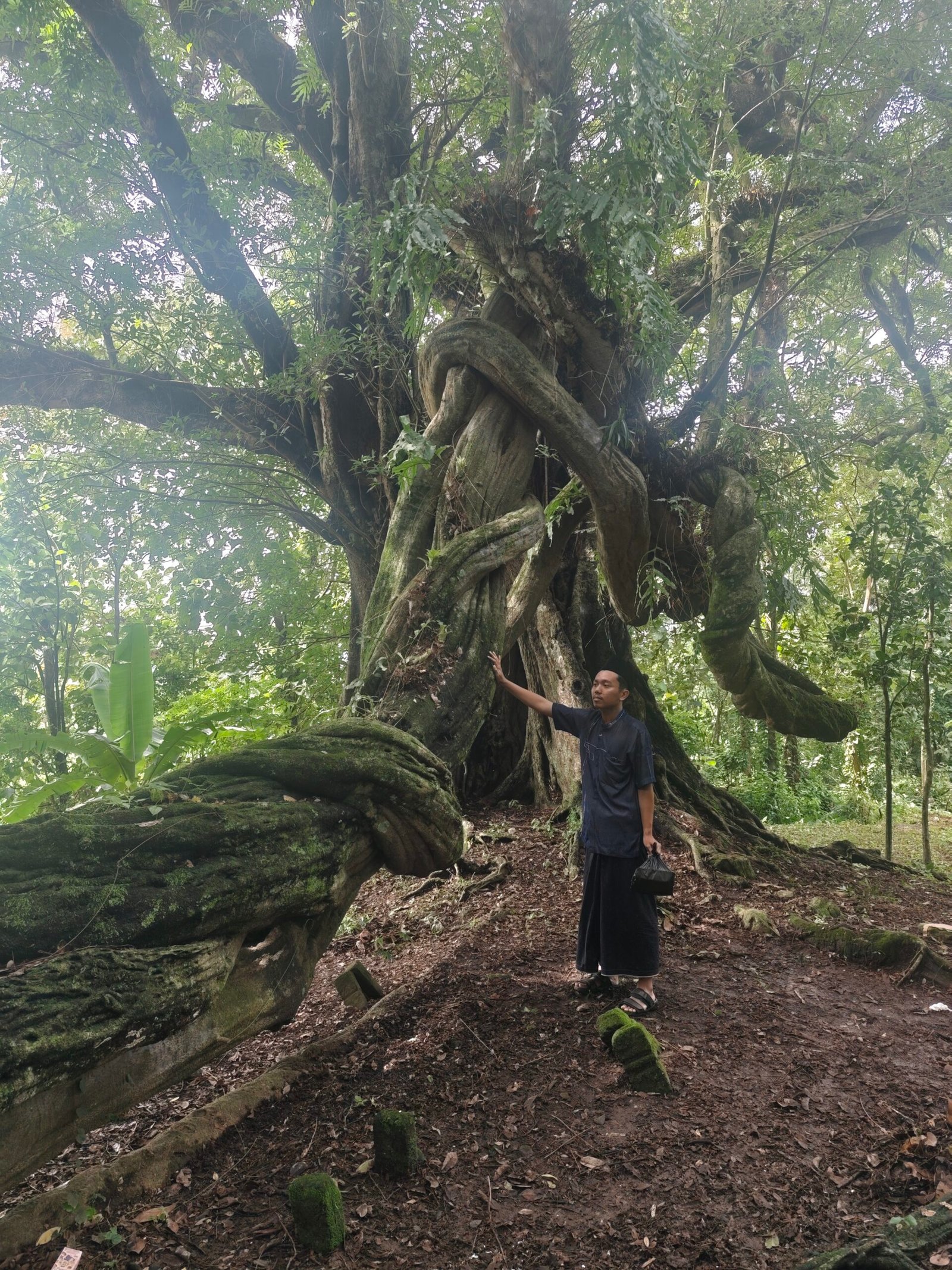 Pohon jenis Ficus retusa ini menjadi pusat perhatian karena keunikan biologisnya. Batang utamanya dililit oleh tanaman Rawadan setebal satu meter, menciptakan ilusi optik menyerupai dua ular raksasa yang saling berpasangan. Fenomena ini oleh masyarakat setempat dianggap sebagai simbol keseimbangan alam sekaligus penjaga gaib desa.