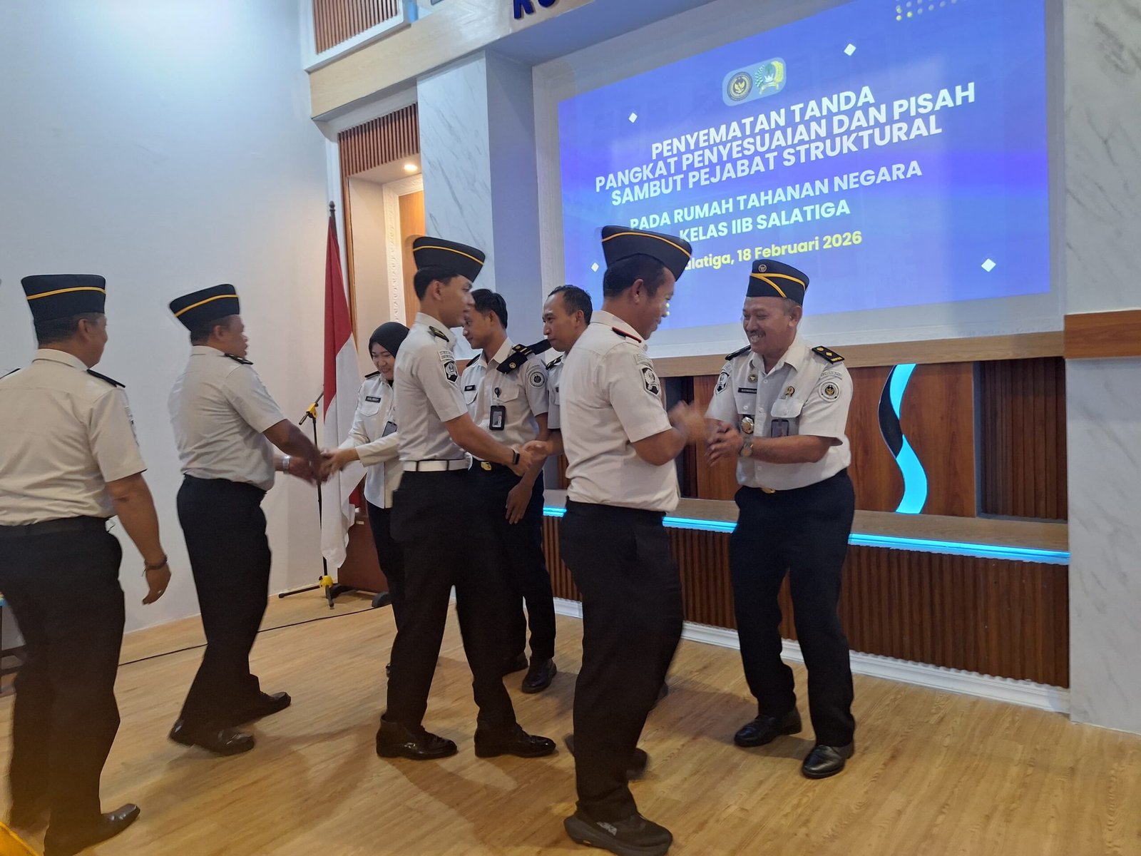 SALATIGA | HARIAN7.COM – Rutan Salatiga merotasi pejabat struktural sekaligus menyematkan kenaikan pangkat penyesuaian, Rabu, 18 Februari 2026. Aula rutan menjadi saksi pergantian tongkat komando di lini pengamanan dan penguatan karier pegawai.