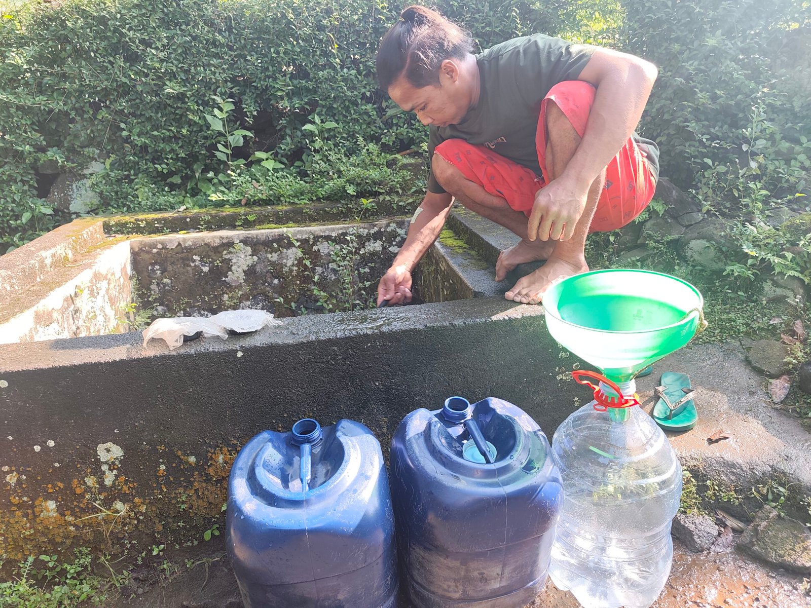 Kondisi ini memaksa warga mencari alternatif untuk memenuhi kebutuhan pokok. Bagi yang tidak memiliki sumur gali, mereka harus membawa jerigen ke mata air (sendang) umum.
