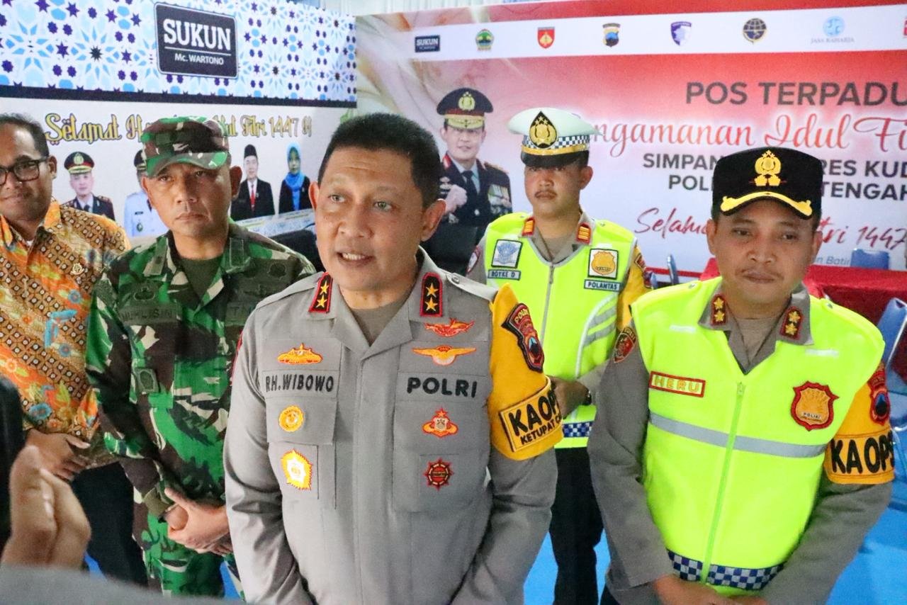 KUDUS |  HARIAN7.COM –  Kapolda Jawa Tengah Ribut Hari Wibowo memastikan pelaksanaan arus mudik Lebaran 2026 di wilayah Jawa Tengah berlangsung aman, lancar, dan kondusif. Hal itu disampaikan saat meninjau Pos Terpadu Ops Ketupat Candi 2026 Polres Kudus di Alun-Alun Simpang Tujuh Kudus, Senin (23/3/2026).