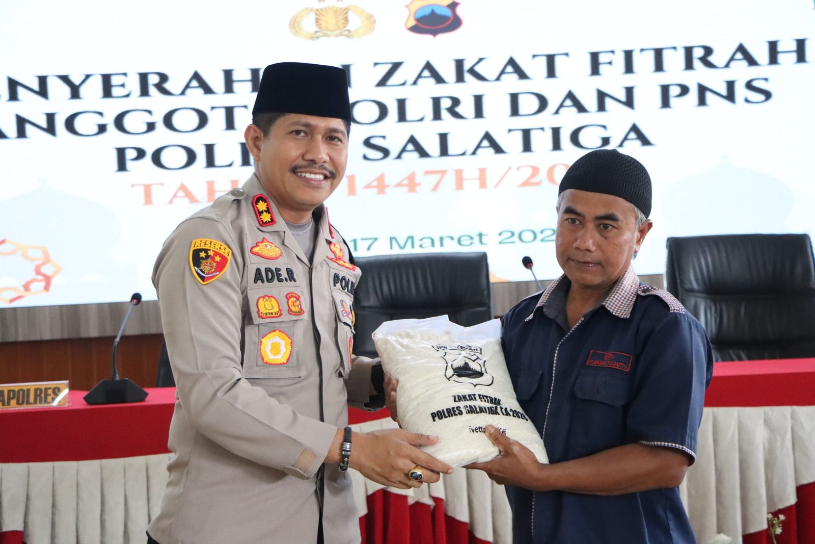 Penyerahan dilakukan di Pendopo Widya Qasana Tribrata Polres Salatiga. Beras zakat fitrah tersebut selanjutnya didistribusikan ke sejumlah lembaga, di antaranya Yayasan Islam Sudirman Tingkir, Pondok Pesantren Darul Busro, dan Pondok Pesantren Darul Muhajirin, serta masyarakat kurang mampu.