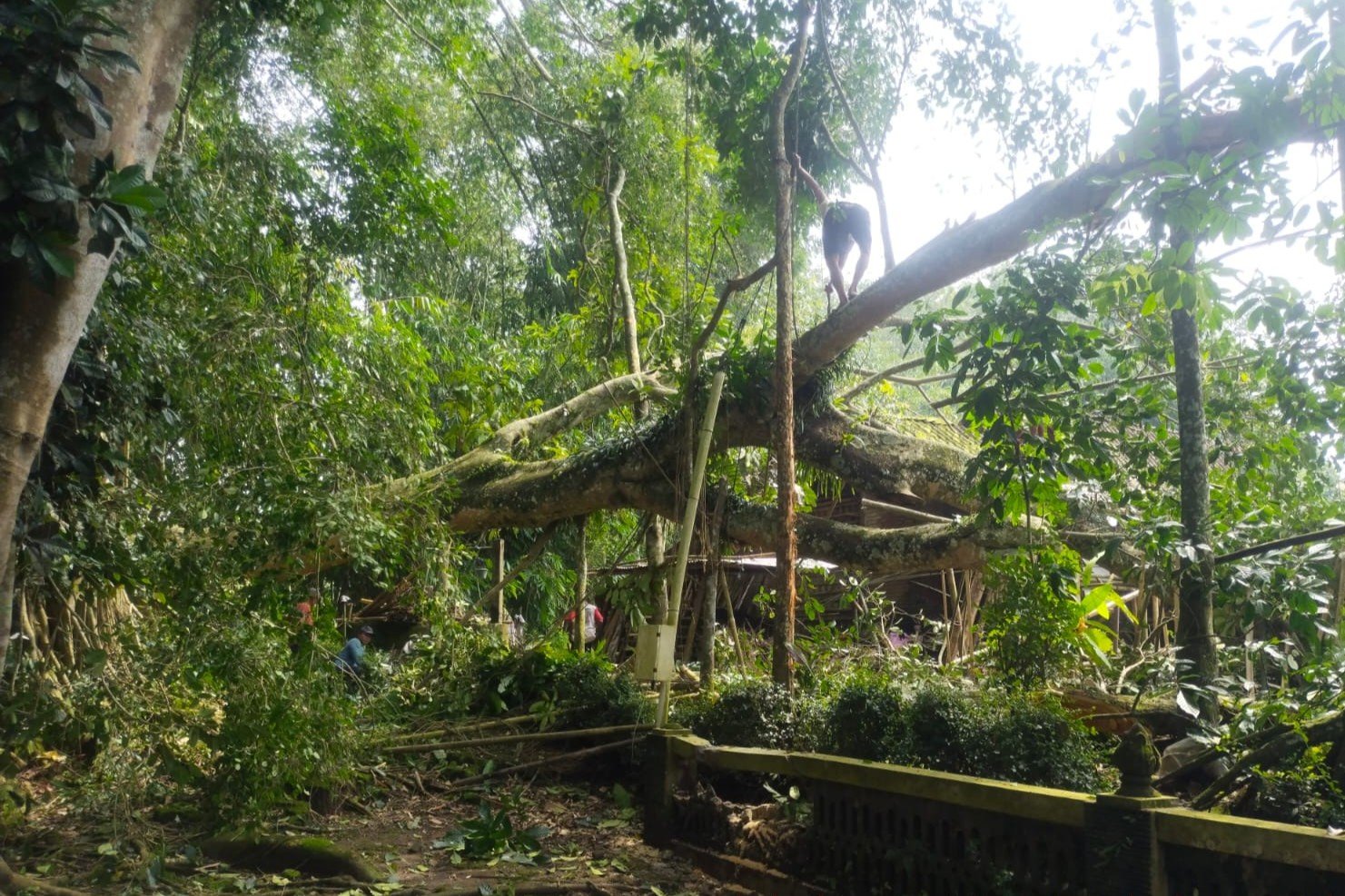 Tanpa tanda-tanda sebelumnya, batang pohon ambruk ke arah bangunan belakang dan menghantam dapur. Material batang dan ranting besar menimpa atap serta dinding hingga mengalami kerusakan.