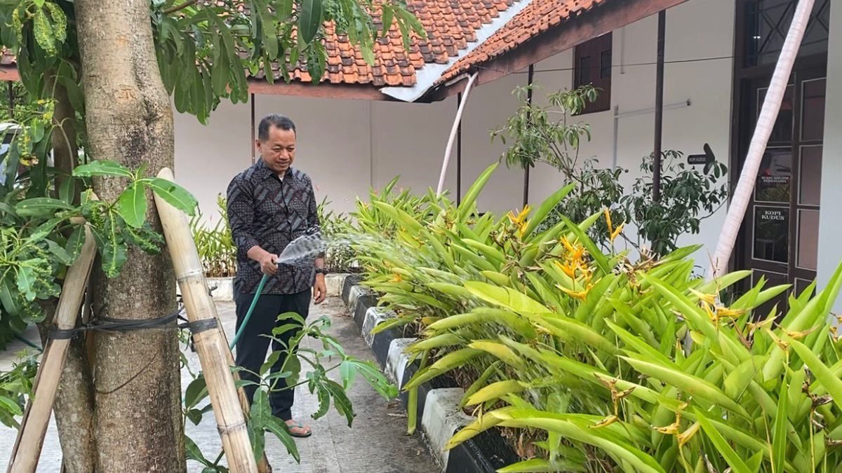Ajakan itu ia contohkan langsung dengan menyirami sejumlah pohon dan tanaman di kompleks Pendapa Kabupaten Kudus, Selasa (7/4/2026). Kegiatan tersebut menjadi simbol pentingnya gerakan penghijauan di tengah ancaman suhu tinggi.