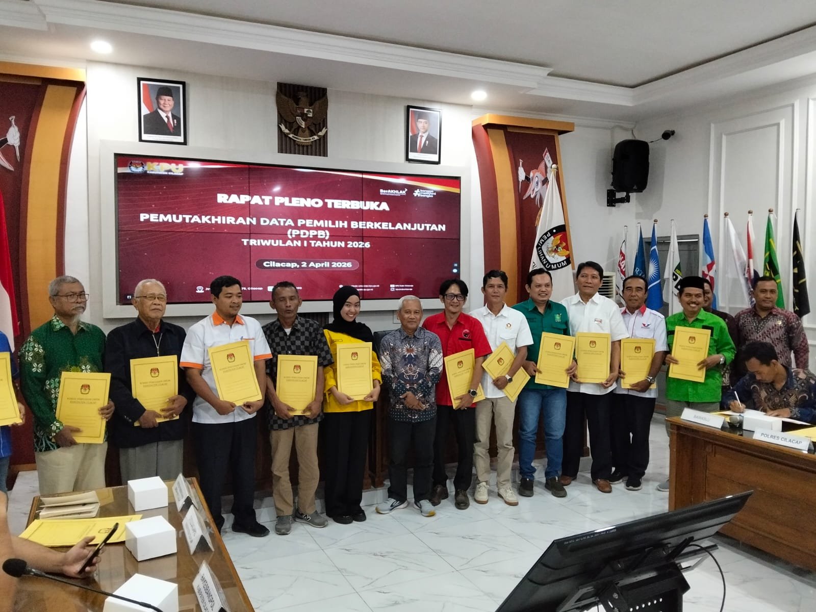 Rapat Pleno yang diselenggarakan Rabu, (02/04/2026) di Aula Kantor KPU Kabupaten Cilacap Jalan MT. Haryono No. 75 Kelurahan Donan Kecamatan Cilacap Tengah Kabupaten Cilacap dihadiri peserta rapat sekitar 40 orang terdiri Komisioner KPU Kabupaten Cilacap, Polresta Cilacap, Bawaslu Kabupaten Cilacap, Kodim 0703 Cilacap, Lanal Cilacap, Disdukcapil Kabupaten Cilacap, Dispermades Kabupaten Cilacap, Bakesbangpol Kabupaten Cilacap, Koordnator Lapas Wilayah Nusakambangan Cilacap dan Lapas Kelas IIB Cilacap serta 18 orang pimpinan Partai Politik tingkat Kabupaten Cilacap.