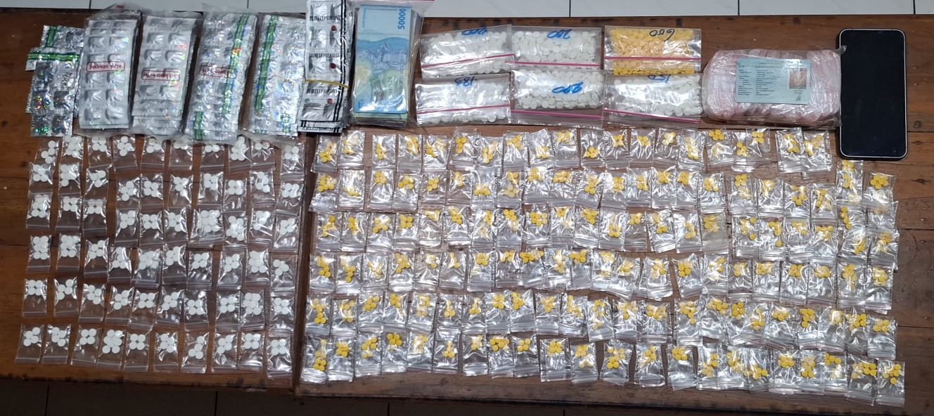 “yakni 1.231 butir Yarindo, 1.561 butir Hexymer, 66 butir Trihexyphenidyl dan 429 butir Tramadol, serta sejumlah barang bukti lainnya berupa uang tunai, handphone, dan plastik klip,” jelasnya.