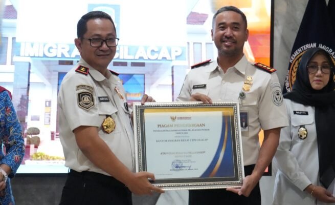 Kepala Kantor Imigrasi Cilacap, Ryo Achdar menerima penghargaan penilaian Kualitas Pelayanan Kantor Imigrasi pada Opini Tahun 2025 dari Kakanwil Direktorat Jenderal Imigrasi Jateng, Haryono Agus Setiawan (istimewa)