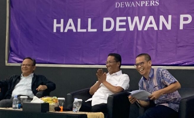 Menteri Hukum Supratman Andi Agtas (tengah) dan Ketua Dewan Pers Prof Komaruddin Hidayat (kiri) saat berdiskusi tentang perlindungan karya jurnalistik dalam RUU Hak Cipta dengan moderator anggota Dewan Pers Dahlan Dahi (kanan) di Hall Dewan Pers, Kamis 23 April 2026. (Foto: Istimewa)