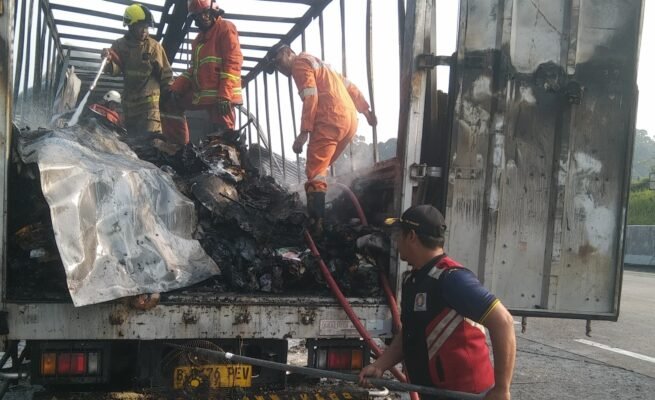 Keterangan foto: Petugas Damkar Kota Salatiga saat memadamkan api yang membakar truk bermuatan paket Shopee di Tol Solo–Semarang KM 450+100, Minggu (19/4/2026) pagi.
