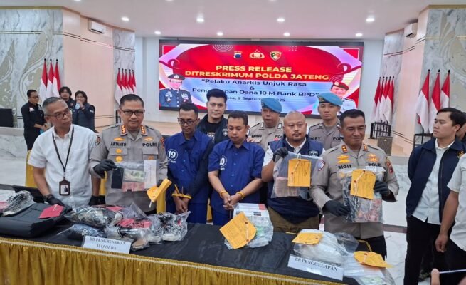Polda Jateng saat mengamankan salah salah satu orang dewasa demo anarko di Kantor Ditreskrimum Polda Jateng, Selasa (2/9/2025). (Foto: Andi Saputra/Harian7.com)