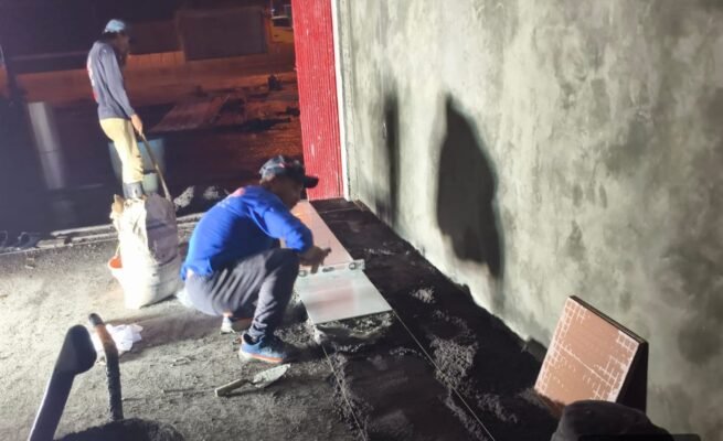 Pekerja proyek Pembangunan Gudang dan Gerai KOPDES Merah Putih sedang melakukan pekerjaan pengacian dinding di malam hari.