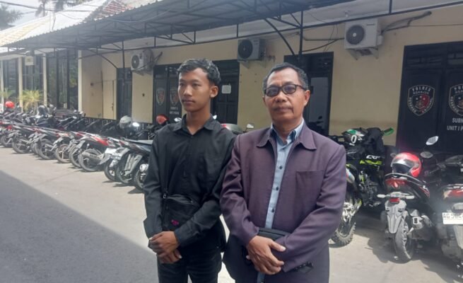 Korban dugaan pengeroyokan, Yoga Septian Pradana (20), didampingi kuasa hukumnya Bambang Purwanto saat mendatangi Polres Nganjuk untuk menanyakan perkembangan penanganan kasus yang dilaporkannya.