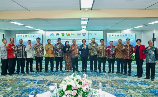 Foto bersama usai Penandatanganan nota kesepahaman (MoU) antara Gubernur Jawa Tengah Ahmad Luthfi, tujuh kepala daerah, dan Menteri Lingkungan Hidup Hanif Faisol Nurofiq di Kantor Kementerian LHK, Jakarta, Senin (13/4/2026)
