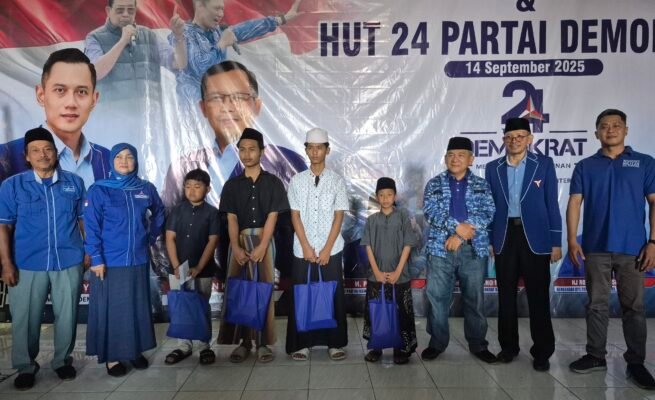 Dewan Pimpinan Cabang (DPC) Partai Demokrat saat menggelar syukuran HUT ke-24 Partai Demokrat di kantor DPC, Selasa (9/9/2025). Foto: Andi Saputra/harian7.com