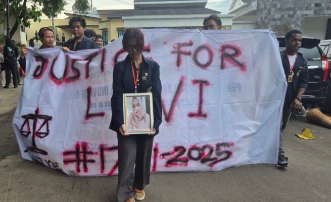 Mahasiswa Untag 17 Agustus saat melakukan aksi demo damai atas kasus meninggalnya Dosen Untag. Foto: (Andi Saputra/harian7.com)