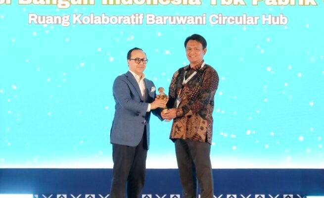 General Manager Solusi Bangun Indonesia Pabrik Cilacap, Moch. Anwar Bakti, menerima Penghargaan Kategori Gold atas program Ruang Kolaboratif Baruwani Circular Hub