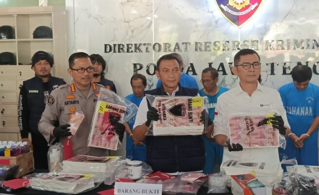 Polda Jateng saat menunjukkan barang bukti uang palsu saat gelar pressconce di Kantor Ditreskrimum Polda Jateng, Selasa (5/8/2025). Foto: (Andi Saputra/Harian7.com).