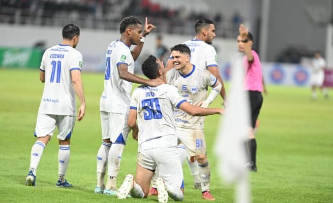 Pemain PSIS Semarang melakukan seblebrasi gol saat mengalahkan Persela Lamongan 1-0 di Stadion Jatidiri Semarang, Sabtu (24/1/2026).